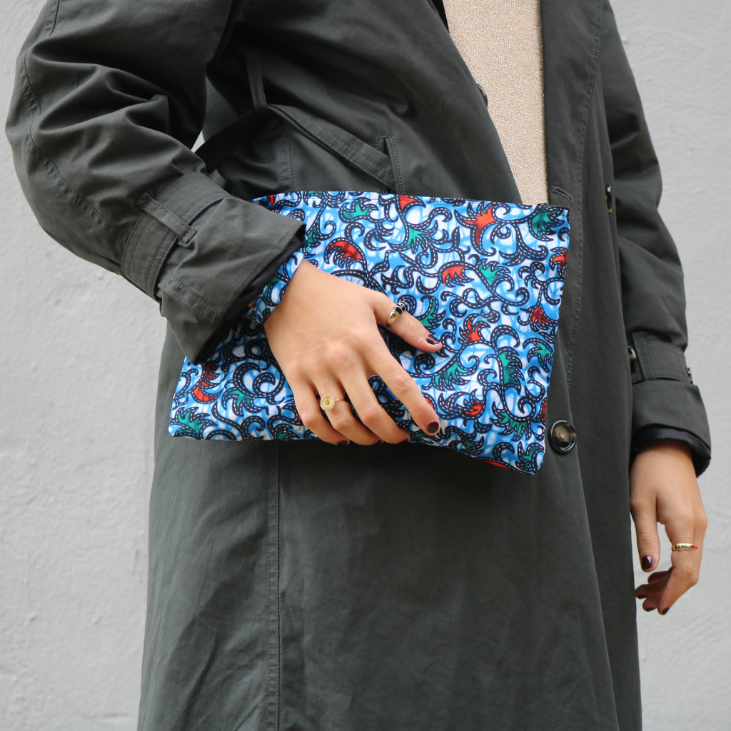 Bolso de mano de tela con estampado tradicional de Burundi, elaborado por artesanos burundeses. Incluye cremallera y asa para mayor comodidad.
