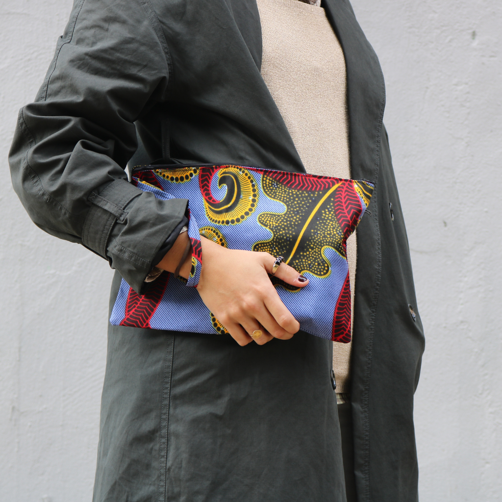 Bolso de mano de tela con estampado tradicional de Burundi, elaborado por artesanos burundeses. Incluye cremallera y asa para mayor comodidad.