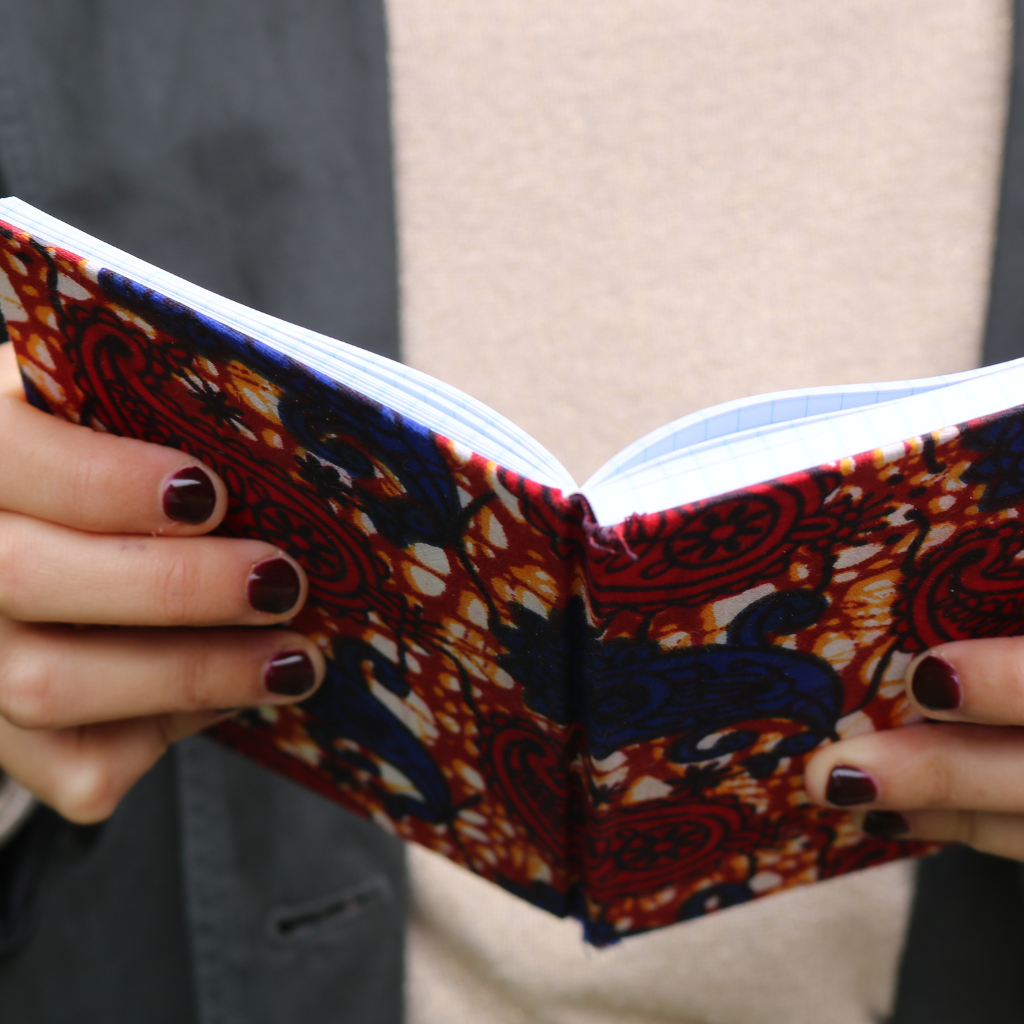 Libreta forrada a mano por artesanos burundeses con tela africana característica de Burundi. Hojas con cuadraditos para anotaciones o uso personal.